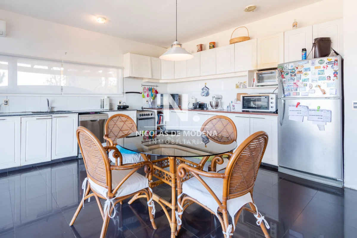 La casa cuenta con una distribución espaciosa que incluye 4 dormitorios, de los cuales 3 son suites, proporcionando un total de capacidad para 9 personas. La amplia cocina está equipada con modernos electrodomésticos como anafe, microondas, lavavajillas, y heladera con freezer, mientras que el elegante living y comedor ofrecen un ambiente perfecto para socializar y relajarse. Cada dormitorio cuenta con placard, y la cocina también está provista con espacio de almacenamiento adicional. El equipamiento adicional como aire acondicionado, TV, campana y horno asegura la máxima comodidad y funcionalidad en cada rincón de la casa.