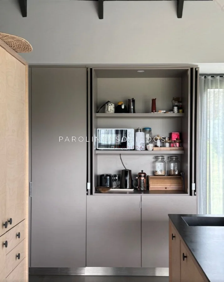 En exterior deck con parrillero techado, cochera para varios vehiculos.