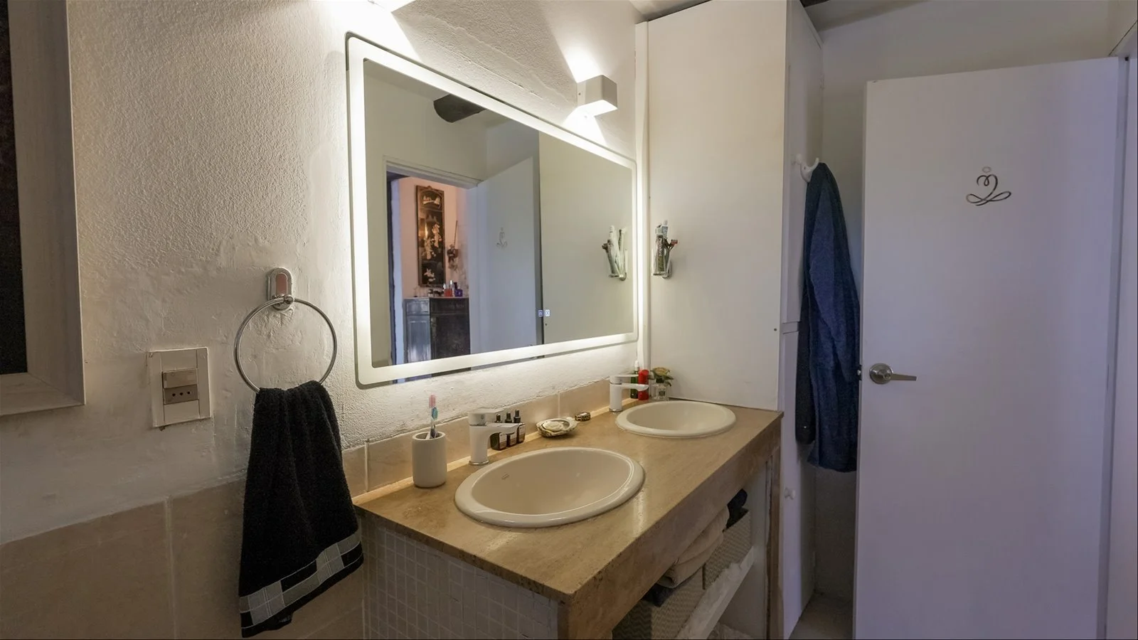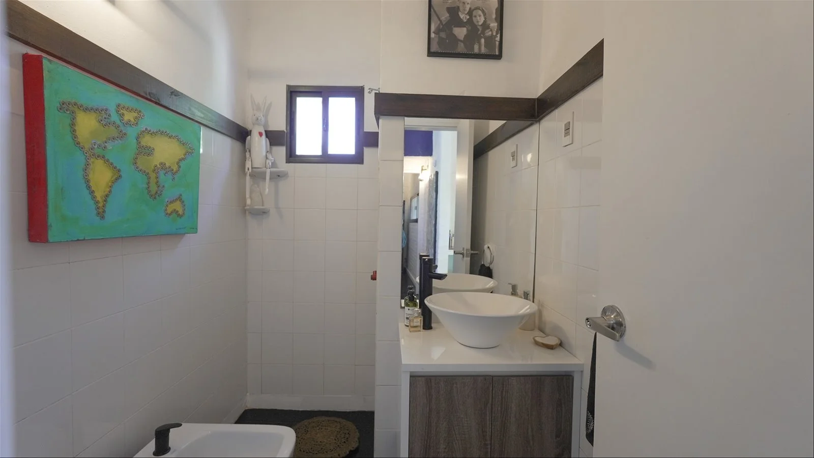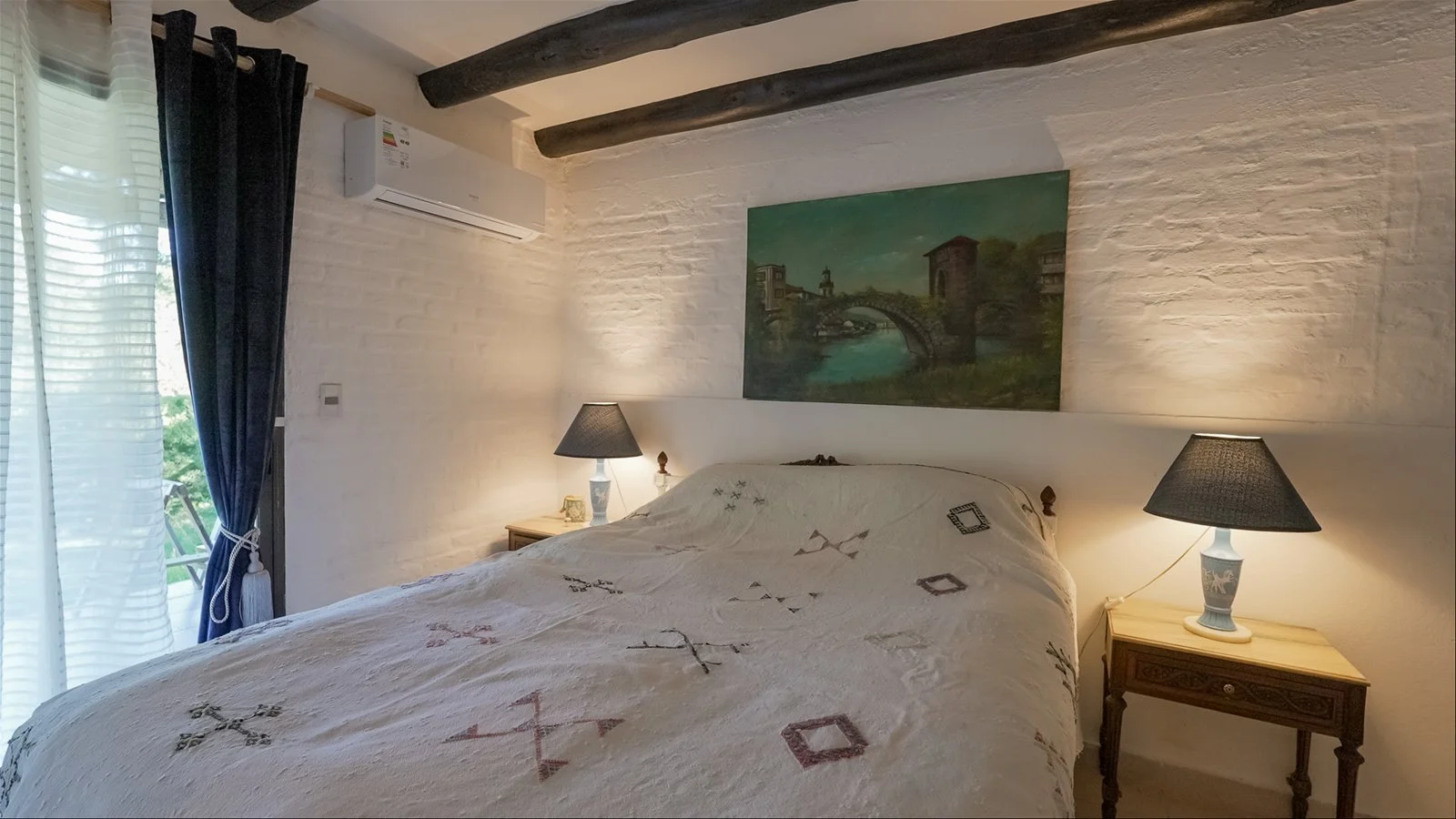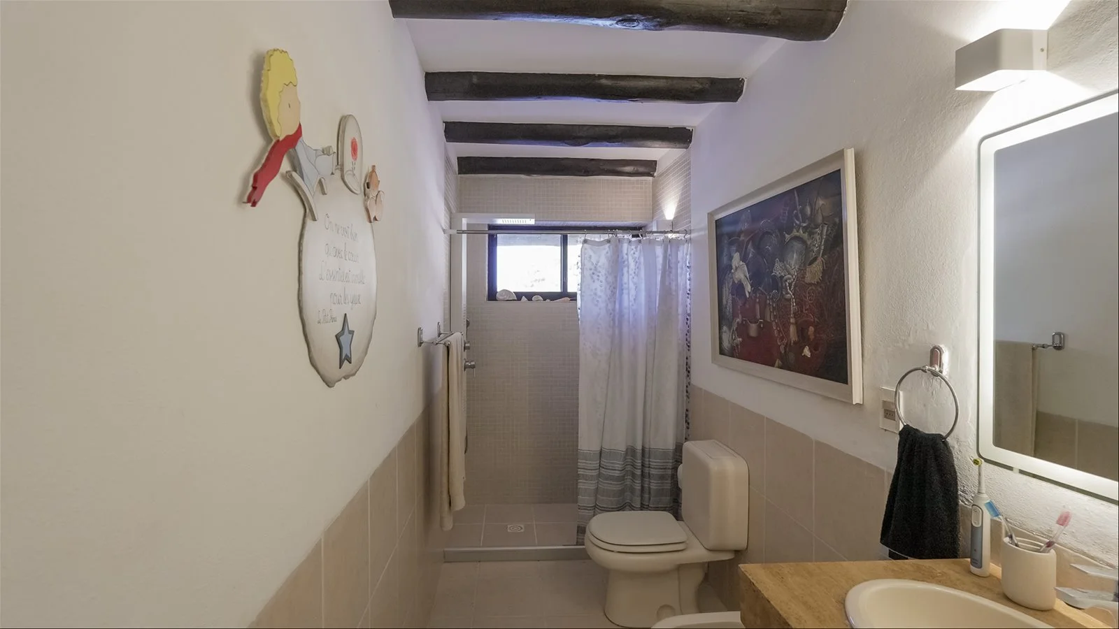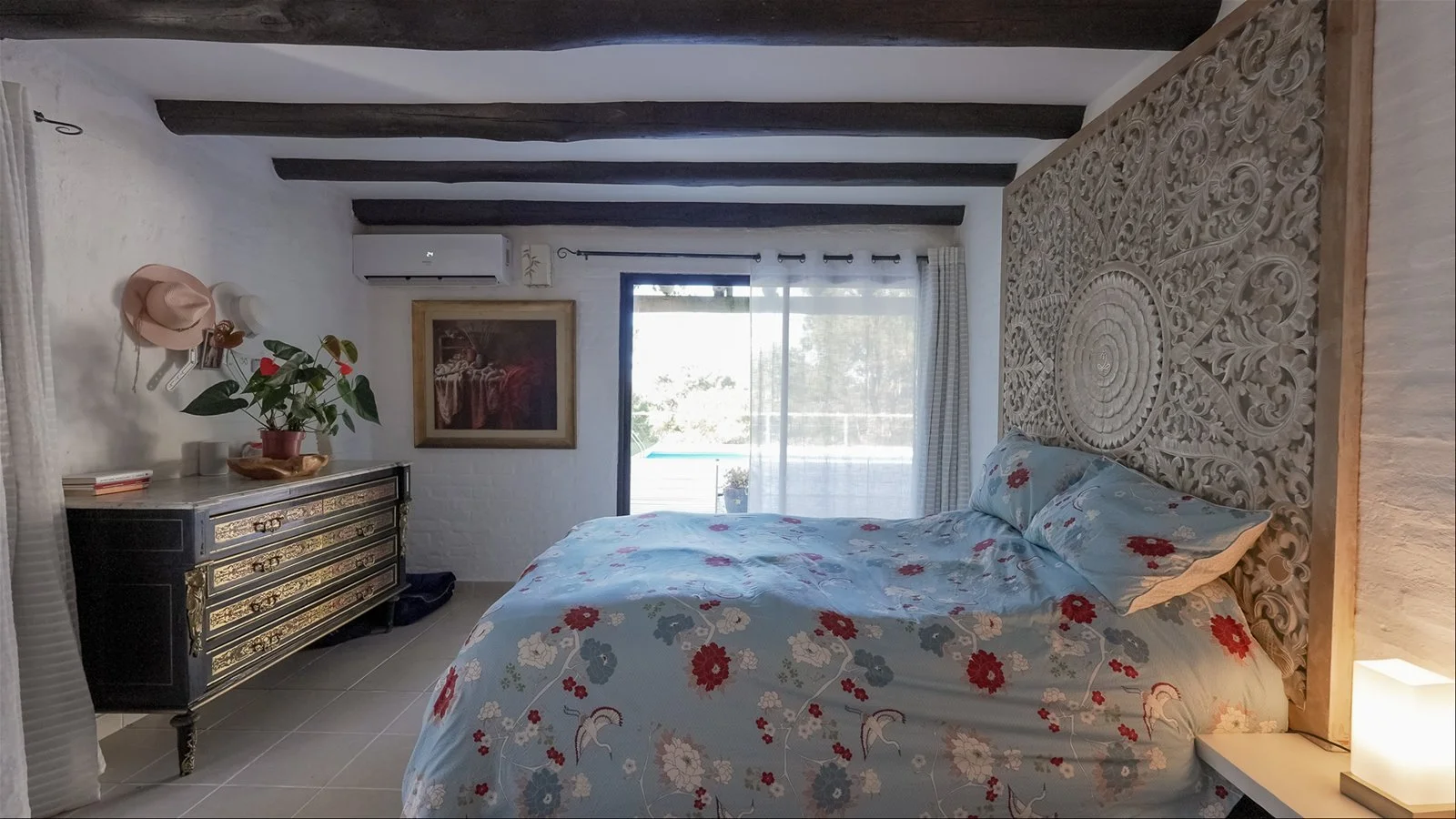 Cuenta con tres amplios dormitorios en suite, todos con acceso a la piscina y placares grandes. El living-comedor es abierto y luminoso, con aire acondicionado, muebles art déco y detalles antiguos. La cocina renovada incluye horno nuevo y una despensa con heladera americana doble.