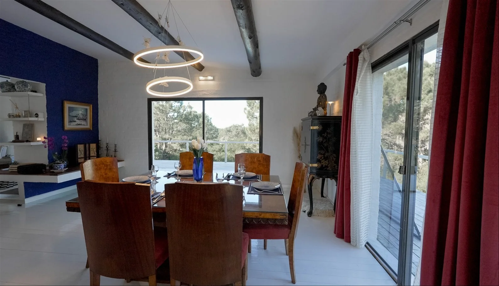 Faro de Luz is a stunning three-level home in the peaceful woods of Faro de José Ignacio. Set on a 1,250 m² private lot, it features a two-level terrace with a covered BBQ area, brick pizza oven, and a pool—perfect for outdoor living.