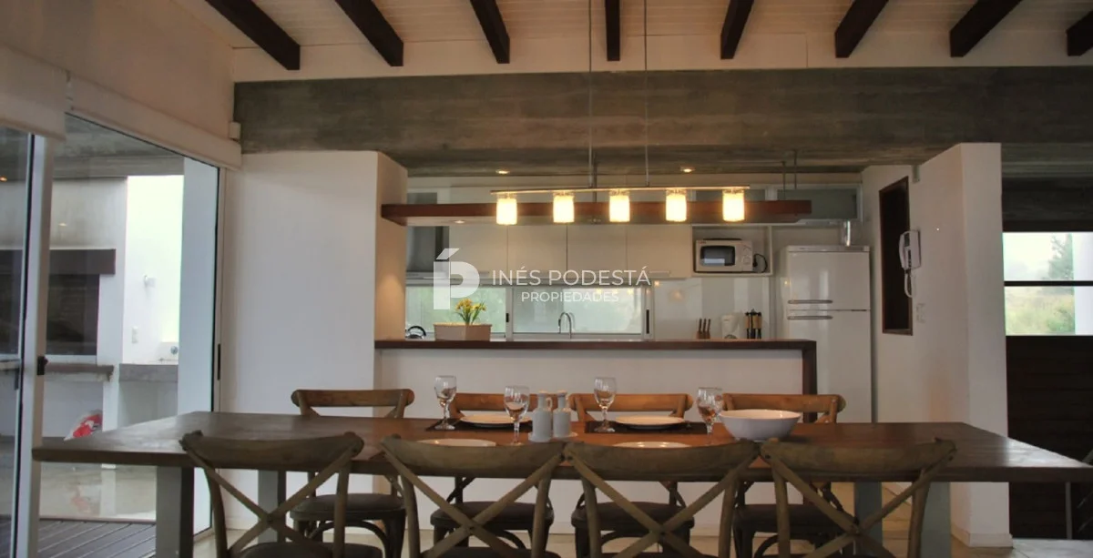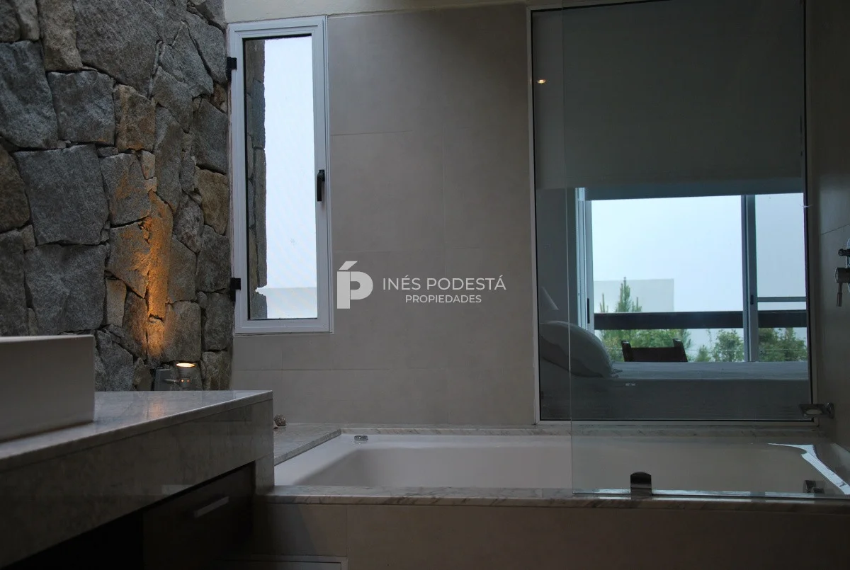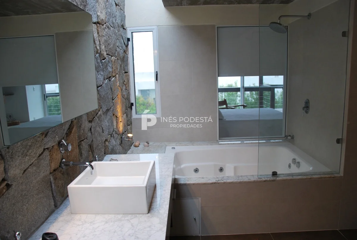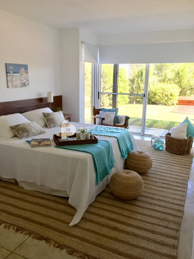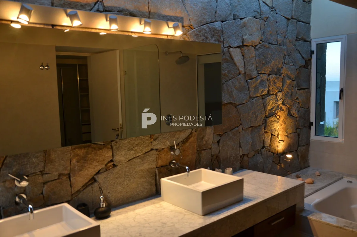 PUNTA PIEDRAS NUEVA!!!!, a 2 cuadras del mar con vista lejana al mar, 5 dormitorios ( 2 suites), piscina climatizada, dependencia de servicio, barbacoa, losa radiante, muy bien puesta y equipada!! Se alquila con mucama. Aire Acondicionado y Loza radiante sectorizada