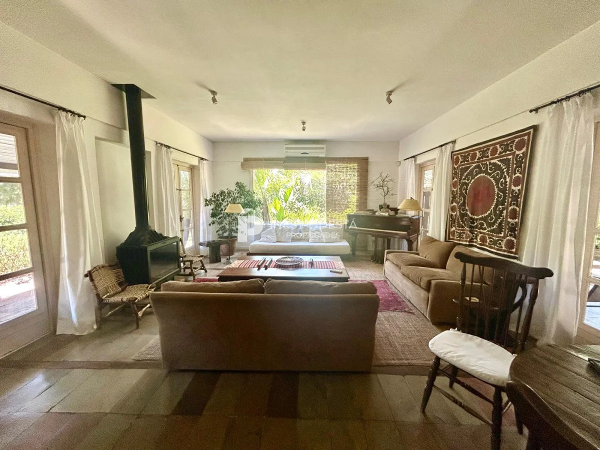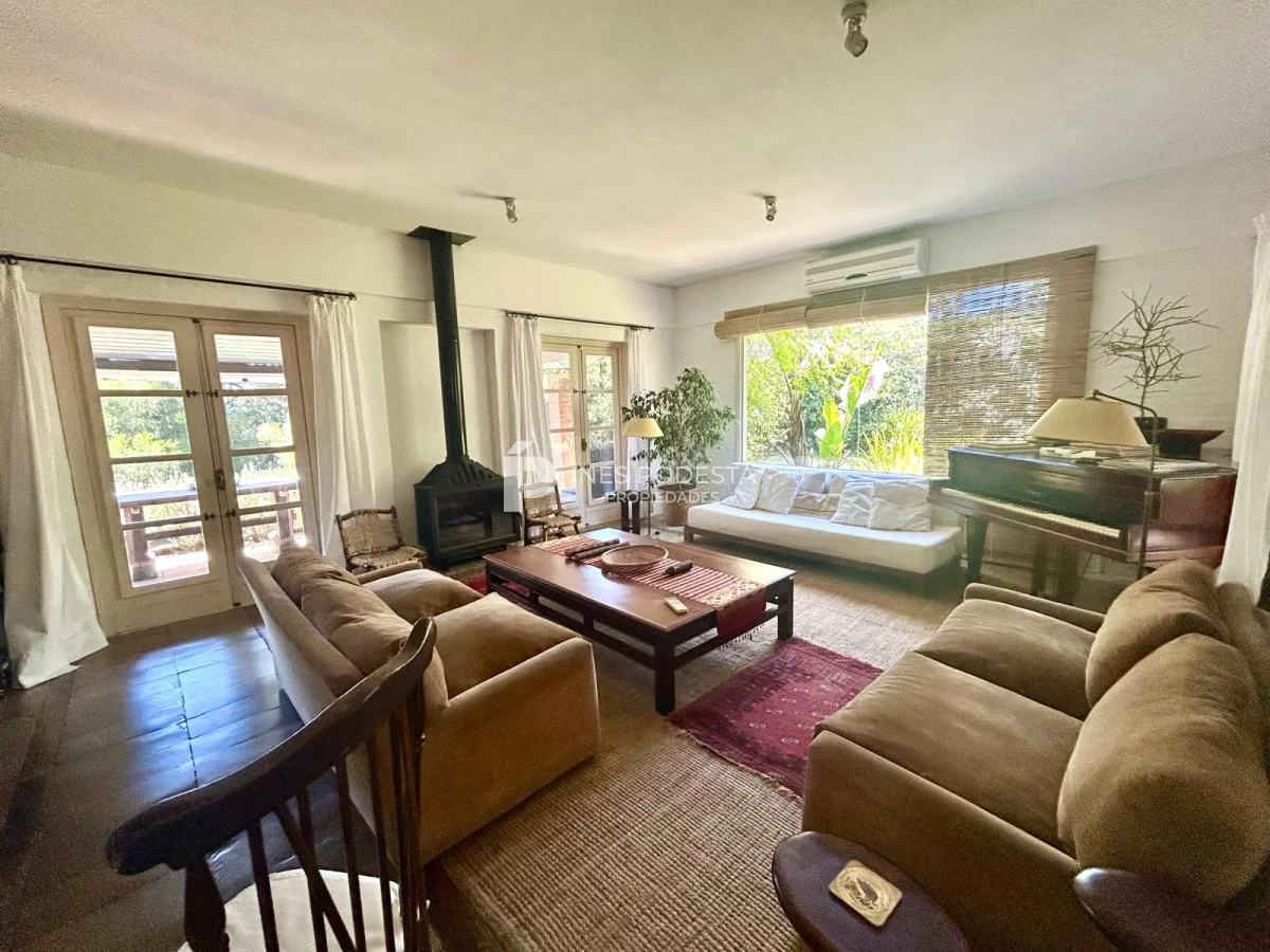 Living comedor con estufa a leña de alto rendimiento, gran ventanal y puertas ventanas con salida a dos galerías techadas, una sobre el jardín al frente y la otra sobre patio interior y parrillero.