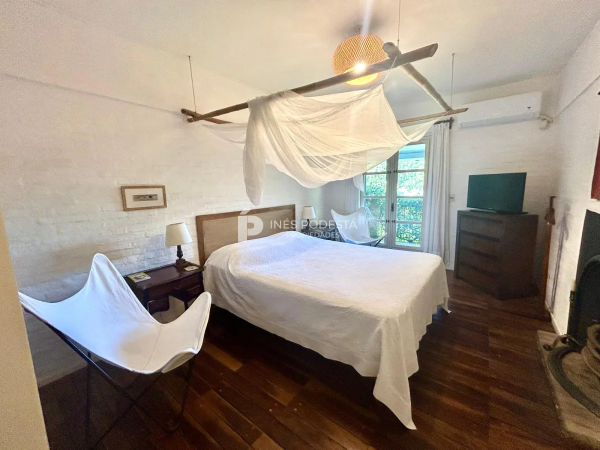 Suite principal: Dormitorio amplio con estufa a leña y balcón sobre jardín al frente, vestidor, piso de lapacho, baño con bañera.