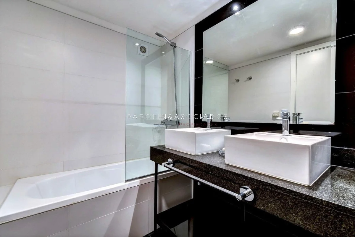 Edificio con piscina abierta semi climatizada, piscina cerrada climatizada, gym, barbacoas de uso común, saunas, recepción 24 horas.