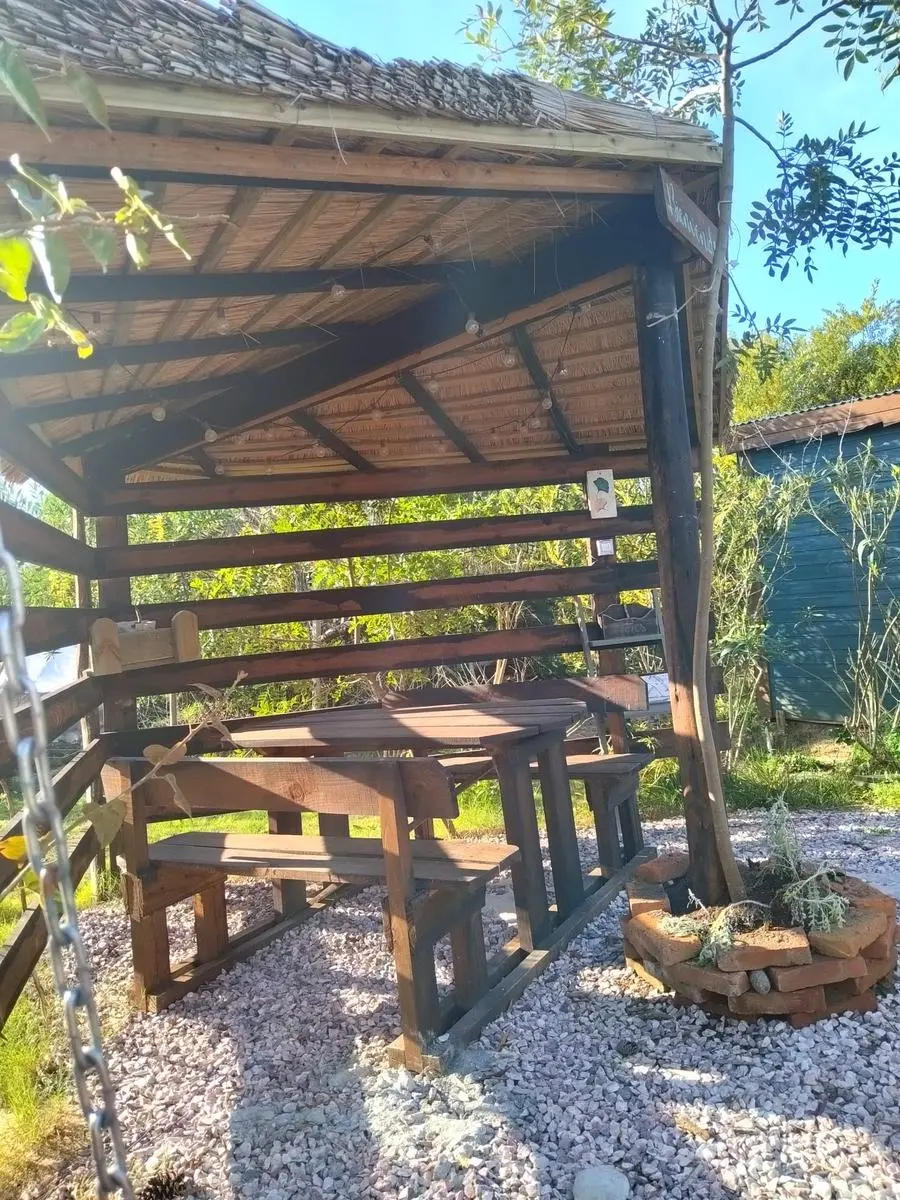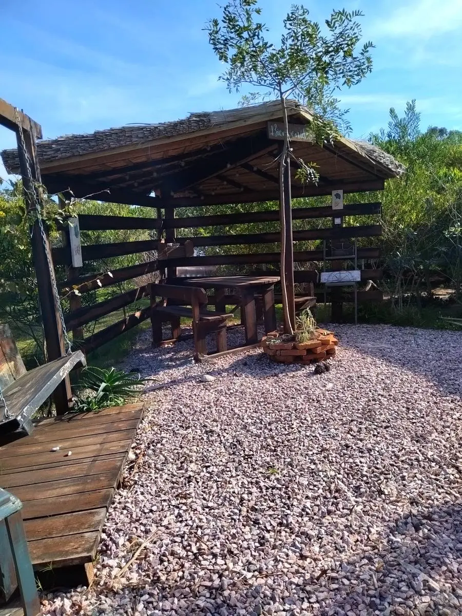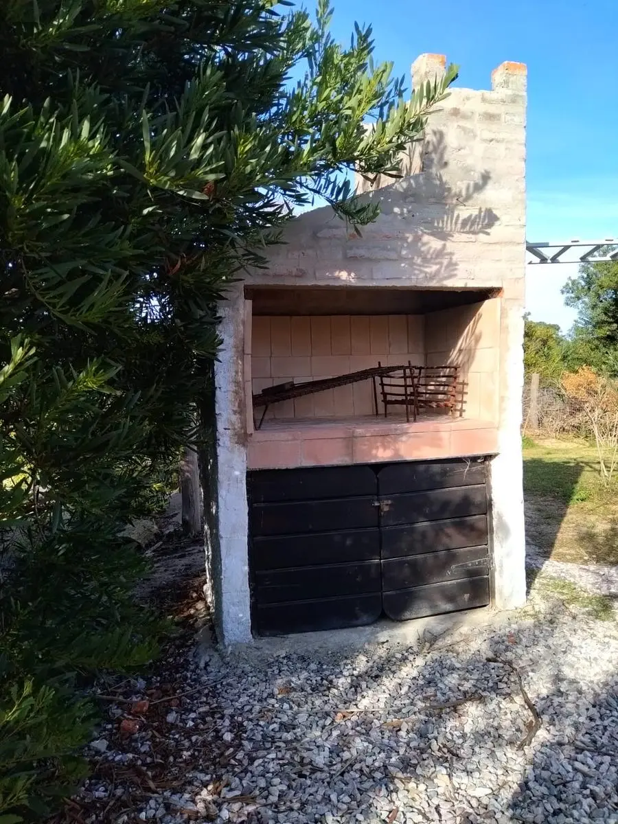 Parrillero y zona de quincho en el exterior de uso individual con mesa y bancos .